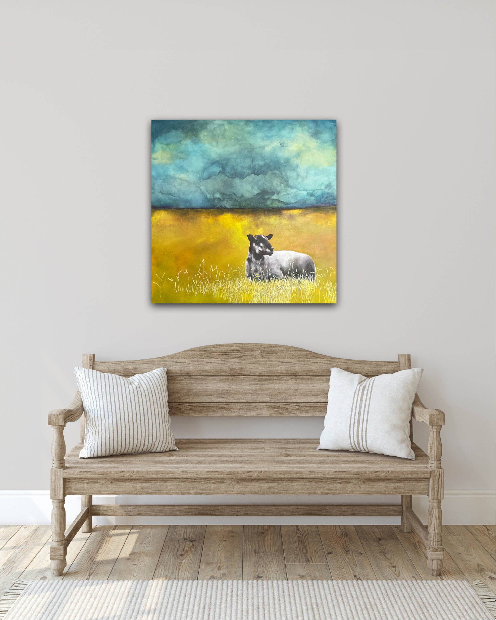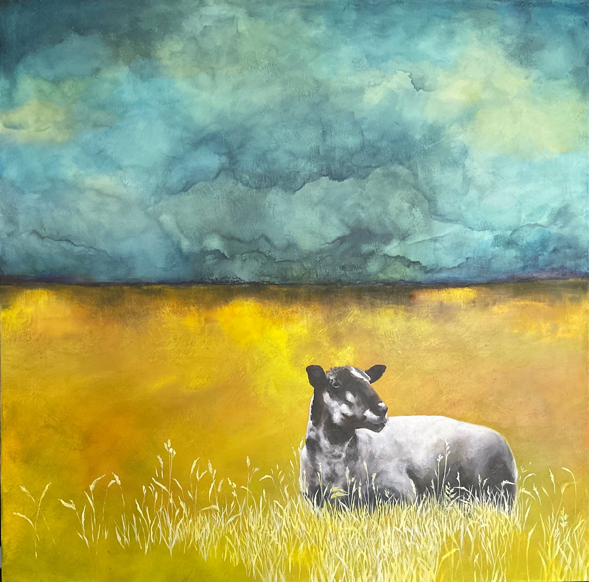 I was captivated by the beauty of this sheep and how it was photographed sitting peacefully in a paddock, I felt compelled to paint it. I had to wonder if it was contemplating its next move hence the name Rest before rising. The harmony between the landscape and the animals that dwell upon it are always a joy for me to paint. The moody skies feel dynamic and captivating.