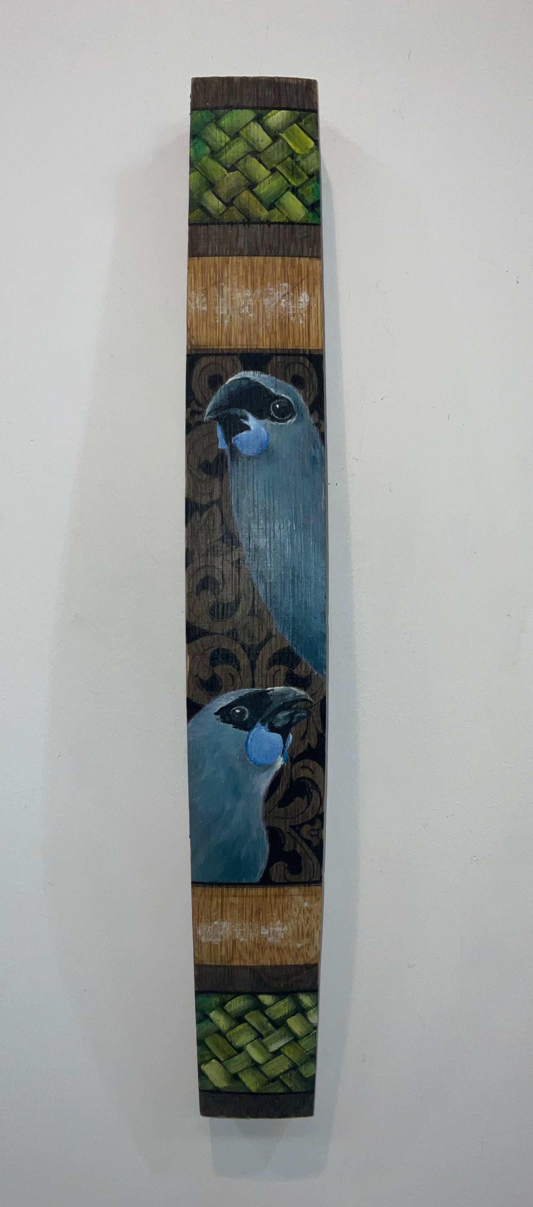 The North Island Kōkako, a beautiful silver blue bird with a a bright wattle and black mask. A favourite subject for artists, I have created my own interpretation on the narrow space of the oak wine barrel stave.
