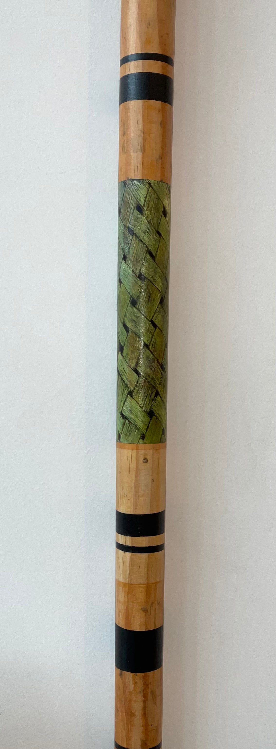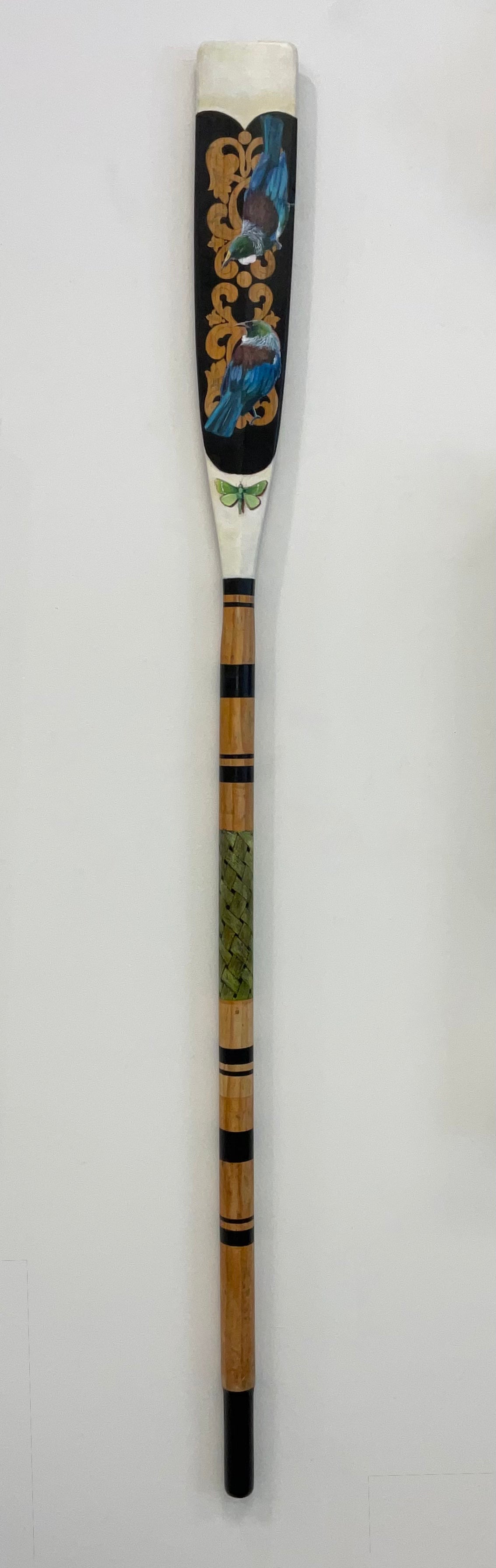 Tui are attracted to the sweet nectar of the flax flower so I have etched into the handle with a harakeke flax weaving style and painted over it to give a textured authentic look.
