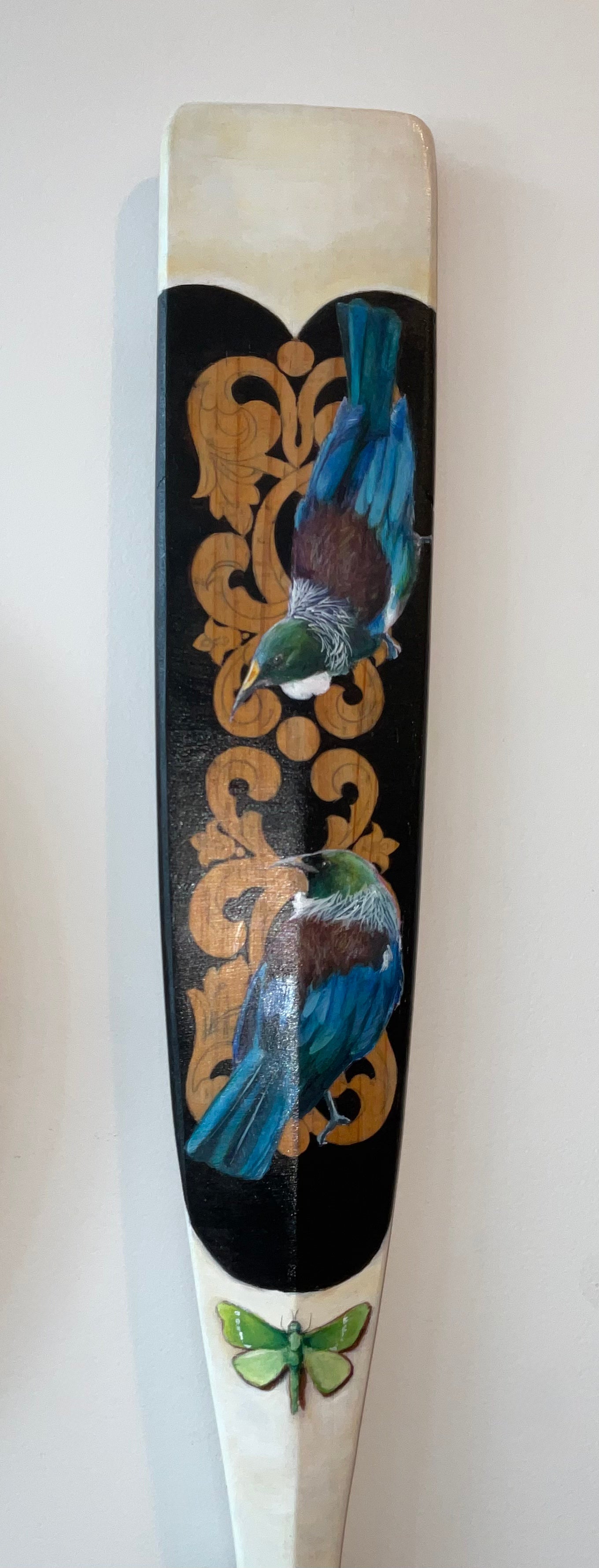 The Tui are a favourite subject and a much loved bird. Their beautiful song often catches the attention of those in close proximity. I have painted them on a baroque style design to enhance their beauty.