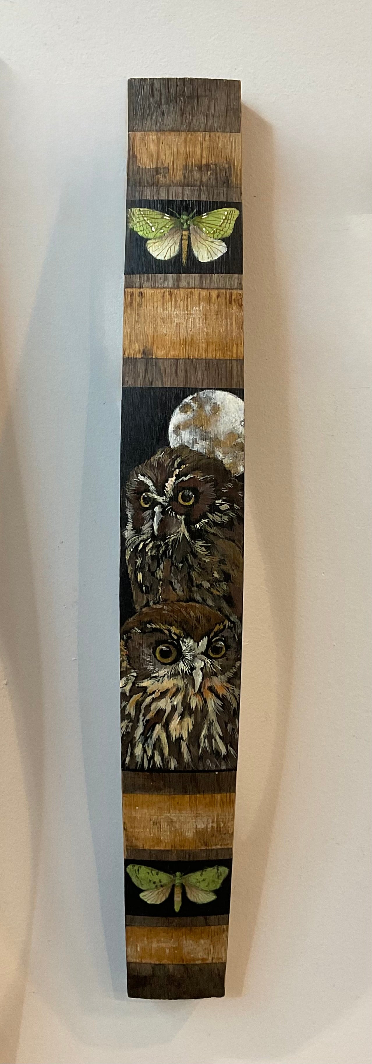 hand painted on wine barrel stave with acrylic paint and finished with varnish.